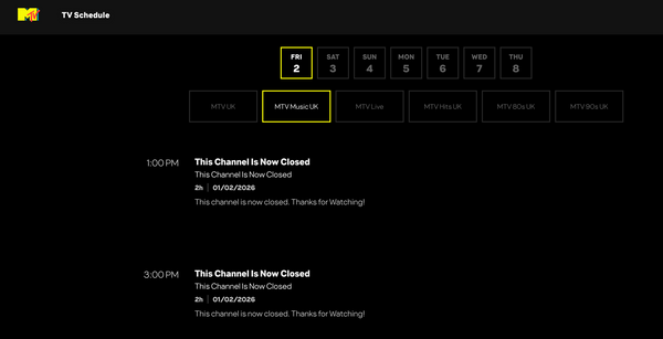 As of January 2, 2026, according to an archived schedule on the channel's website, MTV Classic was still showing music videos, while MTV and MTV2 were airing reality shows and other programming. This shift in content reflects the evolving nature of the channel over the decades.